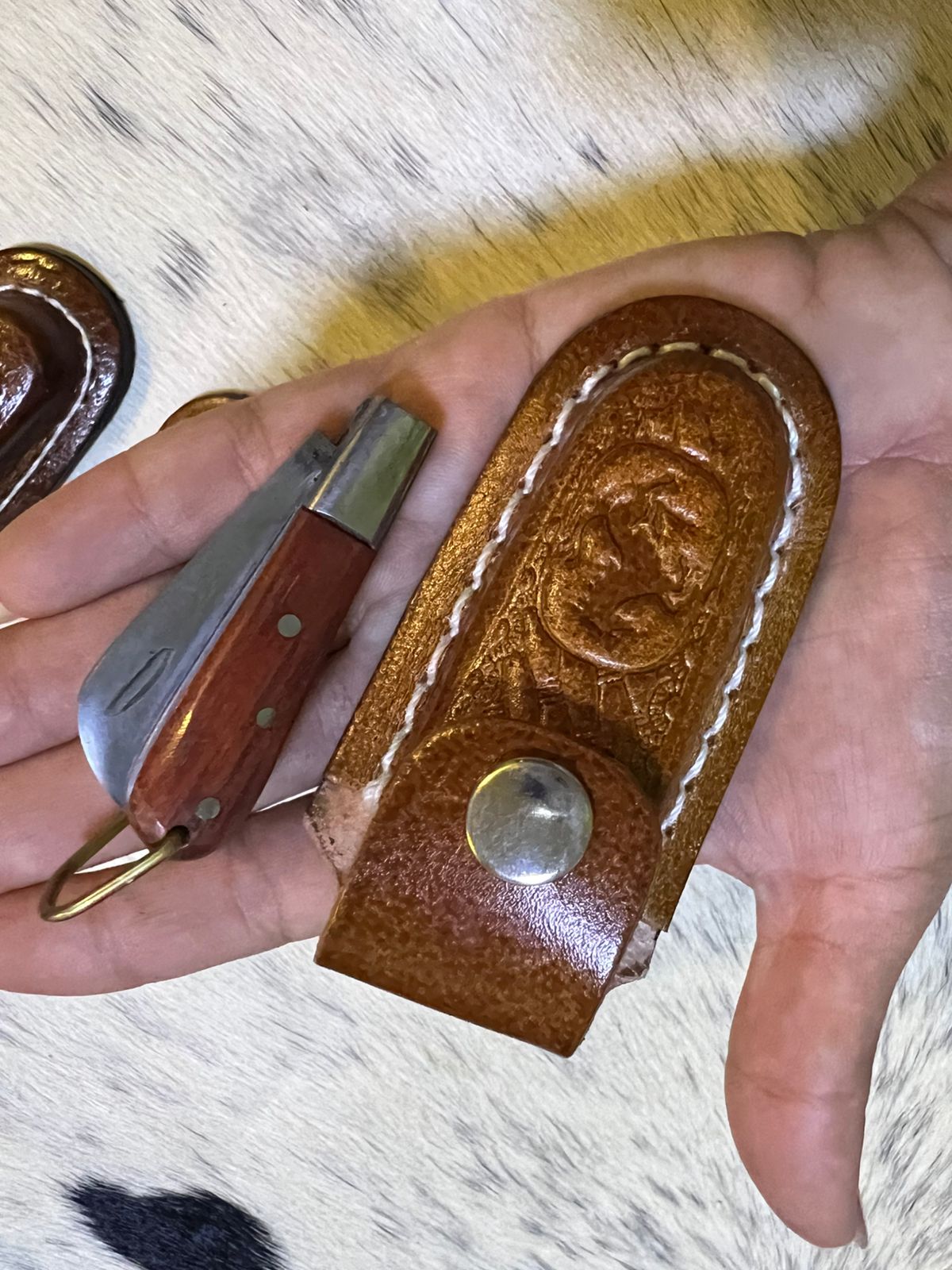 A bainha em couro possui tamanho que se adapta ao mini canivete. Seu design simples facilita o transporte e protege a lâmina, evitando acidentes. Com acabamento rústico em couro natural, o produto é versátil para colecionadores e para uso prático, mantendo o estilo country.