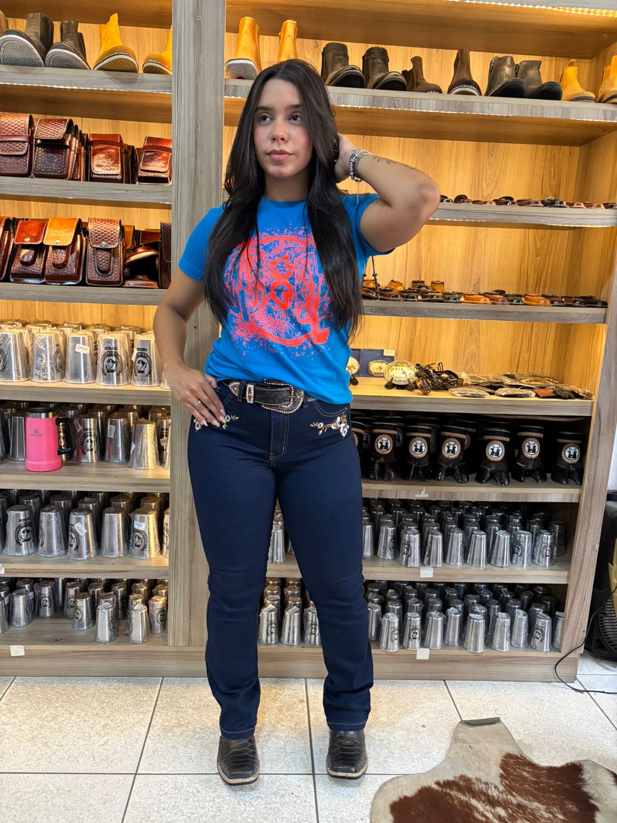 Produzida em tecido jeans azul escuro com costuras reforçadas e detalhes bordados com linhas em tons dourado ocre. O ajuste na cintura e pernas acompanha o formato corpo, ideal para quem busca conforto com estilo country.