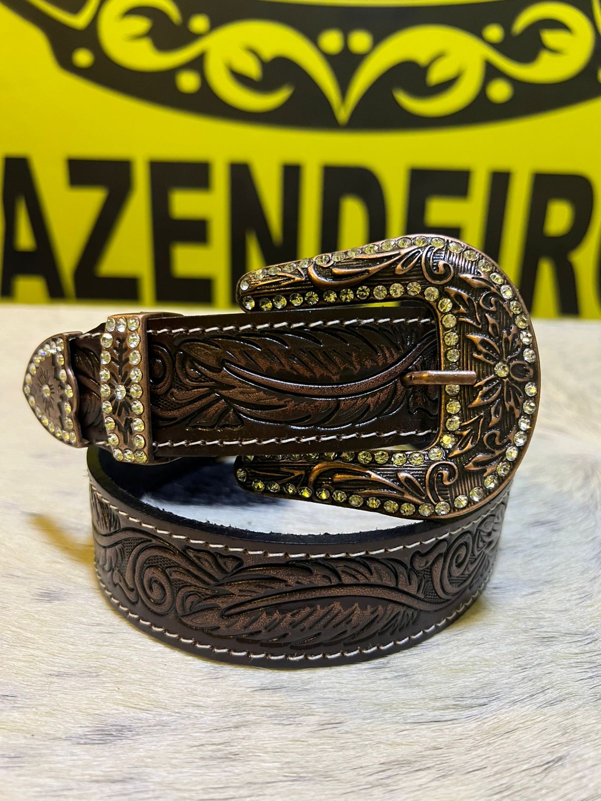 O cinto possui couro marrom trabalhado com detalhes em relevo e uma fivela na cor marrom enfeitada por pedras de strass, que reforçam o estilo country. O fechamento é prático e seguro com fivela tradicional. O produto é indicado para quem busca uma peça única com qualidade e acabamento sofisticado.