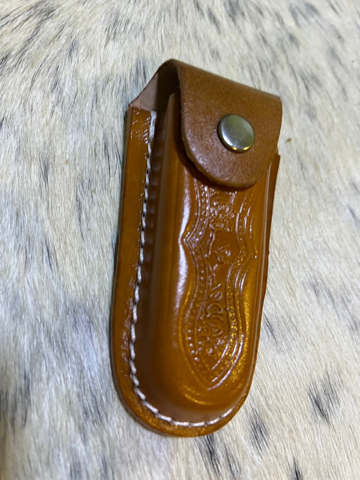 A bainha é confeccionada em couro legítimo com costura resistente, oferecendo proteção contra riscos e facilitando o transporte do canivete. Seu tamanho médio de 13 cm é ideal para manter o canivete firme e acessível.