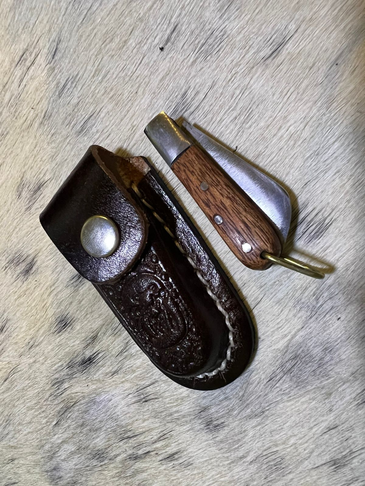 A bainha em couro possui tamanho que se adapta ao mini canivete. Seu design simples facilita o transporte e protege a lâmina, evitando acidentes. Com acabamento rústico em couro natural, o produto é versátil para colecionadores e para uso prático, mantendo o estilo country.