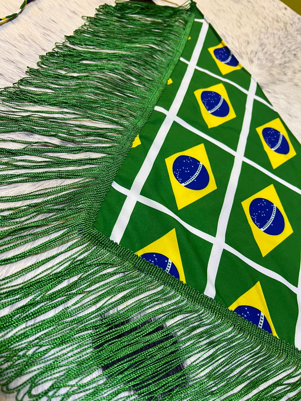 Lenço de cetim com estampa do Brasil com franjas verdes, estampa de bandeirinhas do brasil, e tiras para amarrar, pode se usado como lenço de cabelo, saída de praia ou ate mesmo como cropped.
