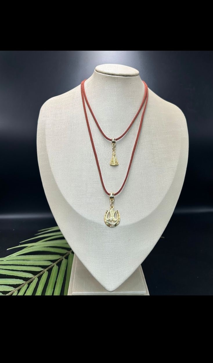 Este chocker dupla traz um pingente delicado de Nossa Senhora e uma linda ferradura com uma bota dentro, para quem gosta de acessórios com estilo country. Feito em couro, ele oferece varias formas de usar e pode combinar com diferentes visuais.