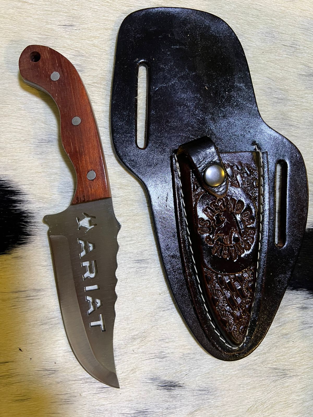 A faca tem tamanho total de 20 cm, com bainha que mede 23 cm, garantindo segurança ao guardar e transportar. O cabo é em material madeira, com rebites que oferecem mais firmeza e durabilidade. A bainha possui passantes para cinto, facilitando o uso em atividades externas.