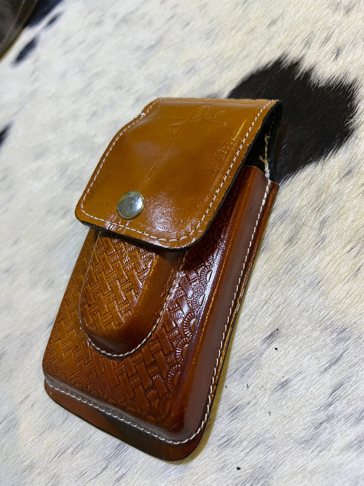A bainha é confeccionada em couro legítimo com detalhes modernos e textura caprichada na superfície. O fechamento por botão de pressão mantém seu celular protegido e o compartimento para canivete fica fixado na parte frontal. O passador para cinto permite transporte prático, ideal para uso no dia a dia no campo ou em ambientes que pedem mobilidade.