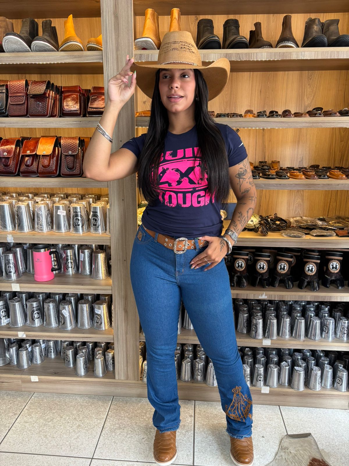 Produzida em tecido jeans azul céu com costuras reforçadas e detalhes bordados com linhas em tons dourado ocre. O ajuste na cintura e pernas acompanha o formato corpo, ideal para quem busca conforto com estilo country.