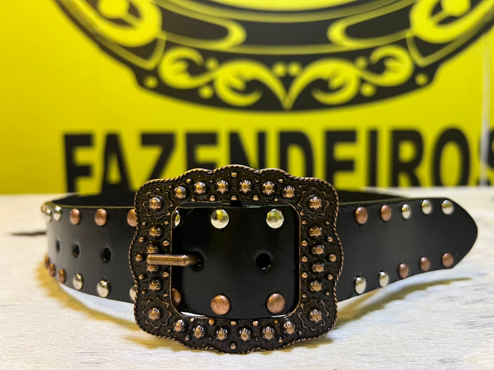 O cinto possui couro preto trabalhado com detalhes em relevo e uma fivela na cor preta enfeitada por relevos, que reforçam o estilo country. O fechamento é prático e seguro com fivela tradicional. O produto é indicado para quem busca uma peça única com qualidade e acabamento sofisticado.