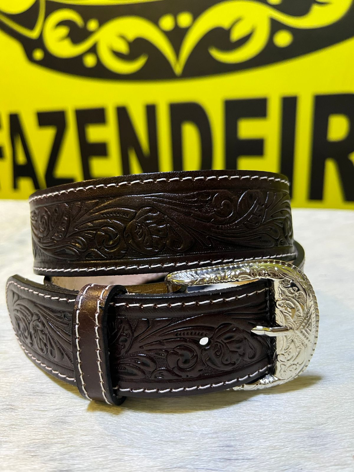 Produzido em couro legítimo com acabamento texturizado. A fivela metálica prata possui detalhes decorativos, trazendo um toque clássico ao cinto. Peça ideal para uso casual, rodeios e eventos country, combinando com jeans e botas. Disponível em varios tamanhos, podendo ser ajustado com furos no couro.