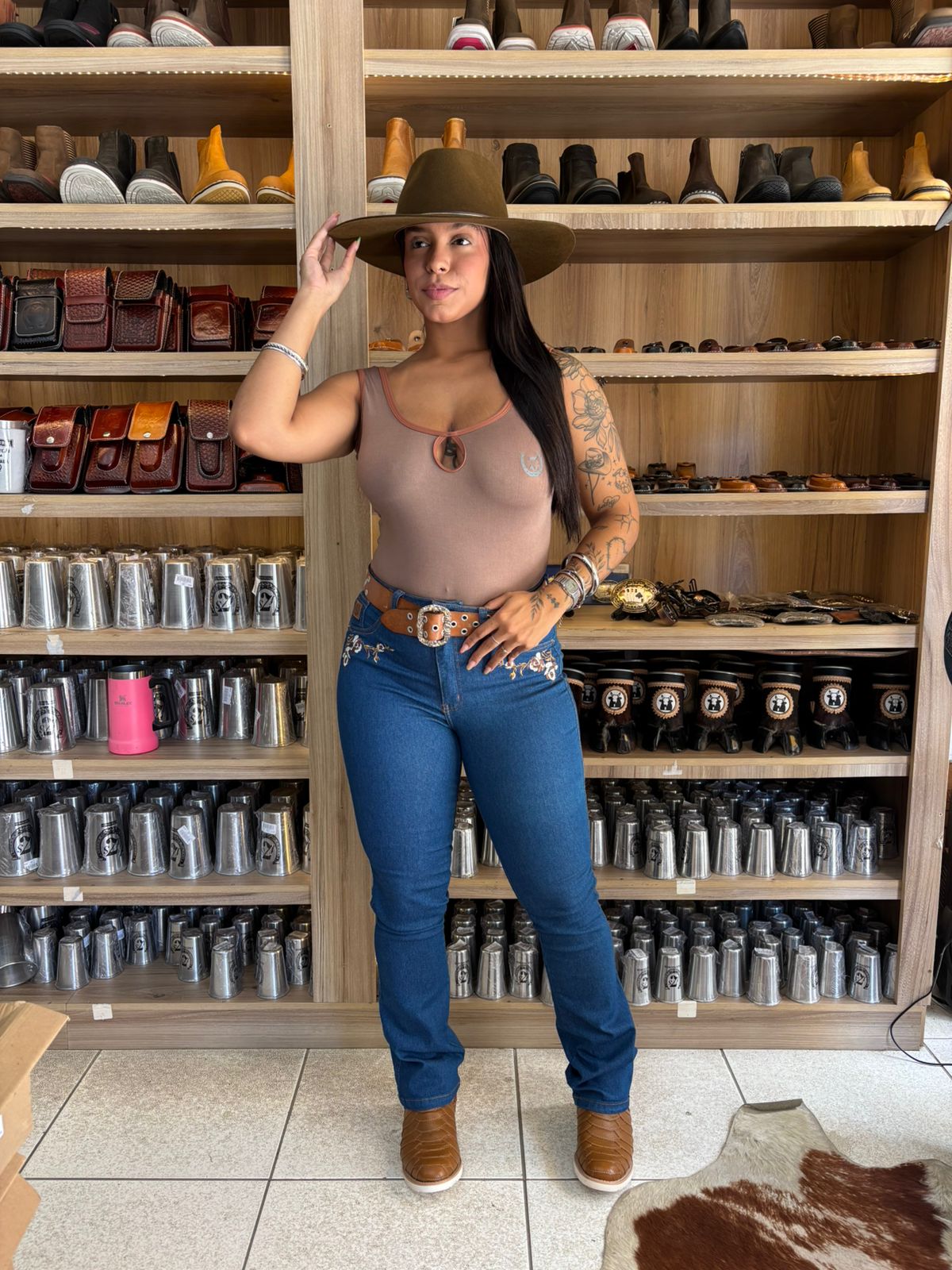 Produzida em tecido jeans azul céu com costuras reforçadas e detalhes bordados com linhas em tons dourado ocre. O ajuste na cintura e pernas acompanha o formato corpo, ideal para quem busca conforto com estilo country.