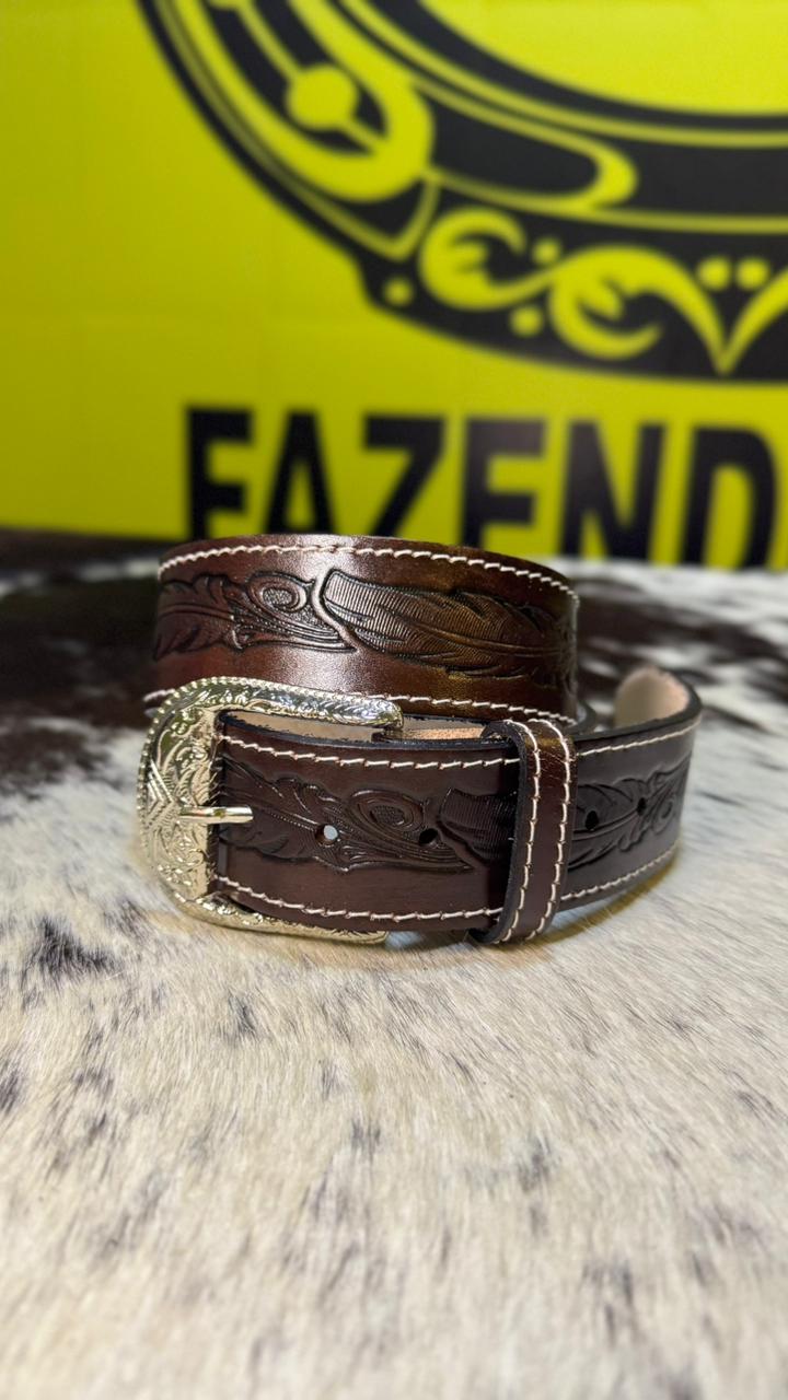 Produzido em couro legítimo com acabamento texturizado. A fivela metálica prata possui detalhes decorativos, trazendo um toque clássico ao cinto. Peça ideal para uso casual, rodeios e eventos country, combinando com jeans e botas. Disponível em varios tamanhos, podendo ser ajustado com furos no couro.