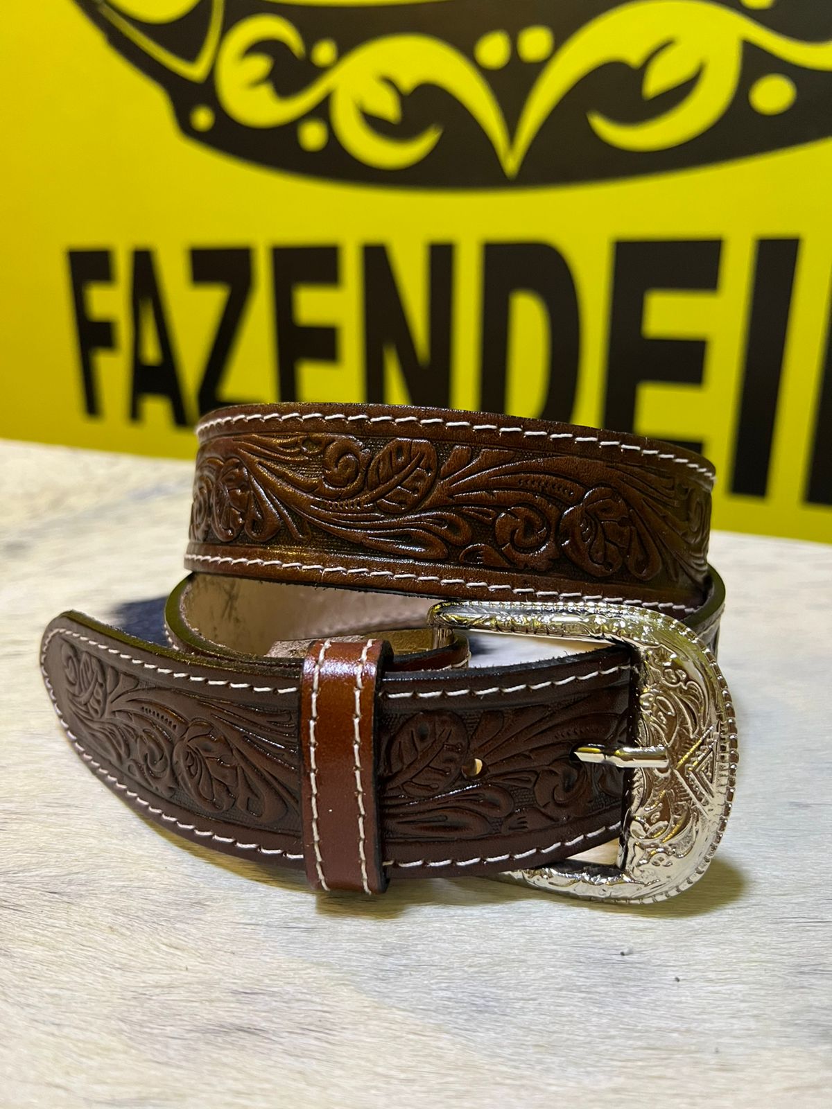 Produzido em couro legítimo com acabamento texturizado. A fivela metálica prata possui detalhes decorativos, trazendo um toque clássico ao cinto. Peça ideal para uso casual, rodeios e eventos country, combinando com jeans e botas. Disponível em varios tamanhos, podendo ser ajustado com furos no couro.