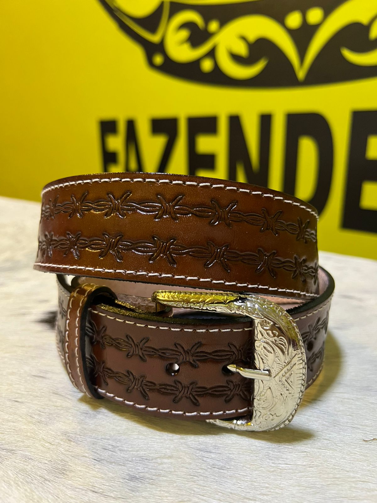 Produzido em couro legítimo com acabamento texturizado. A fivela metálica prata possui detalhes decorativos, trazendo um toque clássico ao cinto. Peça ideal para uso casual, rodeios e eventos country, combinando com jeans e botas. Disponível em varios tamanhos, podendo ser ajustado com furos no couro.