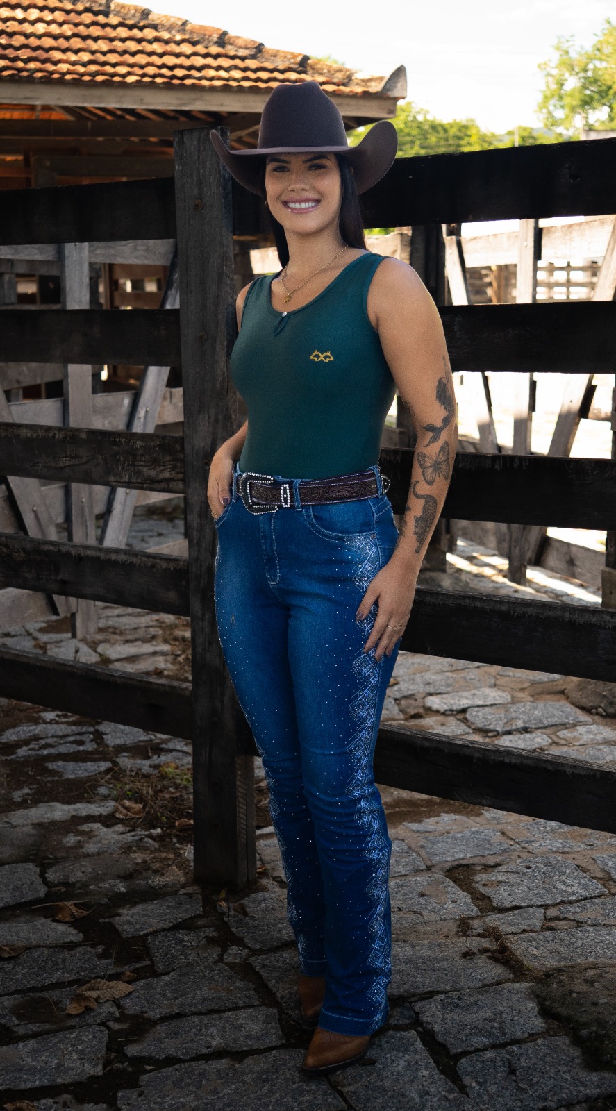Use com botas e camisas de botão para o look country perfeito. Para conservar, lave a mão delicadamente e evite exposição prolongada ao sol para manter o brilho e bordado intactos.