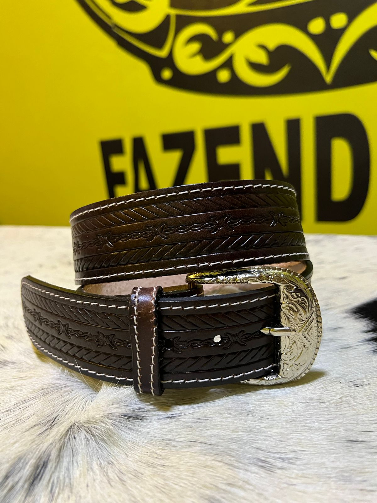 Produzido em couro legítimo com acabamento texturizado. A fivela metálica prata possui detalhes decorativos, trazendo um toque clássico ao cinto. Peça ideal para uso casual, rodeios e eventos country, combinando com jeans e botas. Disponível em varios tamanhos, podendo ser ajustado com furos no couro.