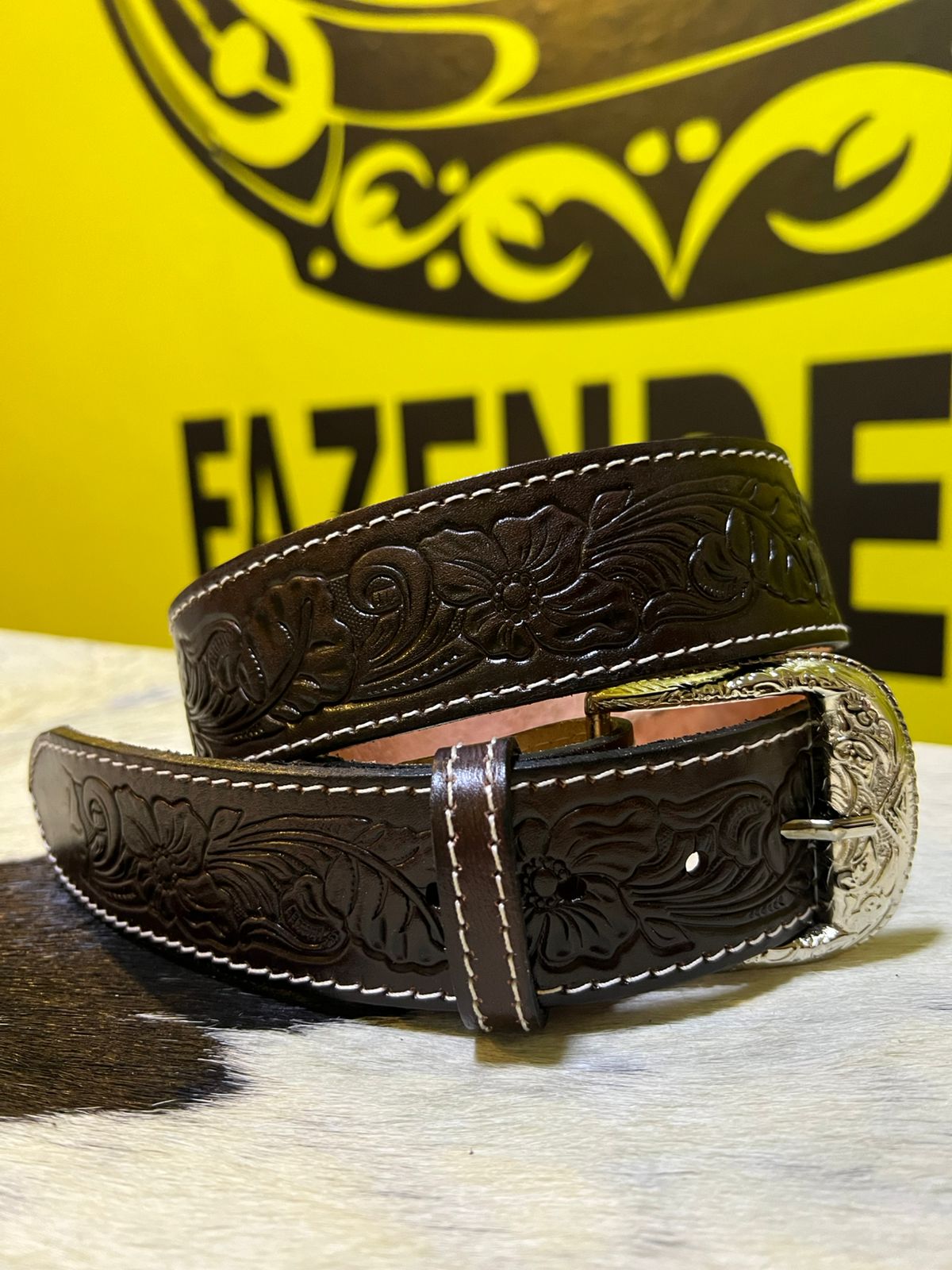Produzido em couro legítimo com acabamento texturizado. A fivela metálica prata possui detalhes decorativos, trazendo um toque clássico ao cinto. Peça ideal para uso casual, rodeios e eventos country, combinando com jeans e botas. Disponível em varios tamanhos, podendo ser ajustado com furos no couro.
