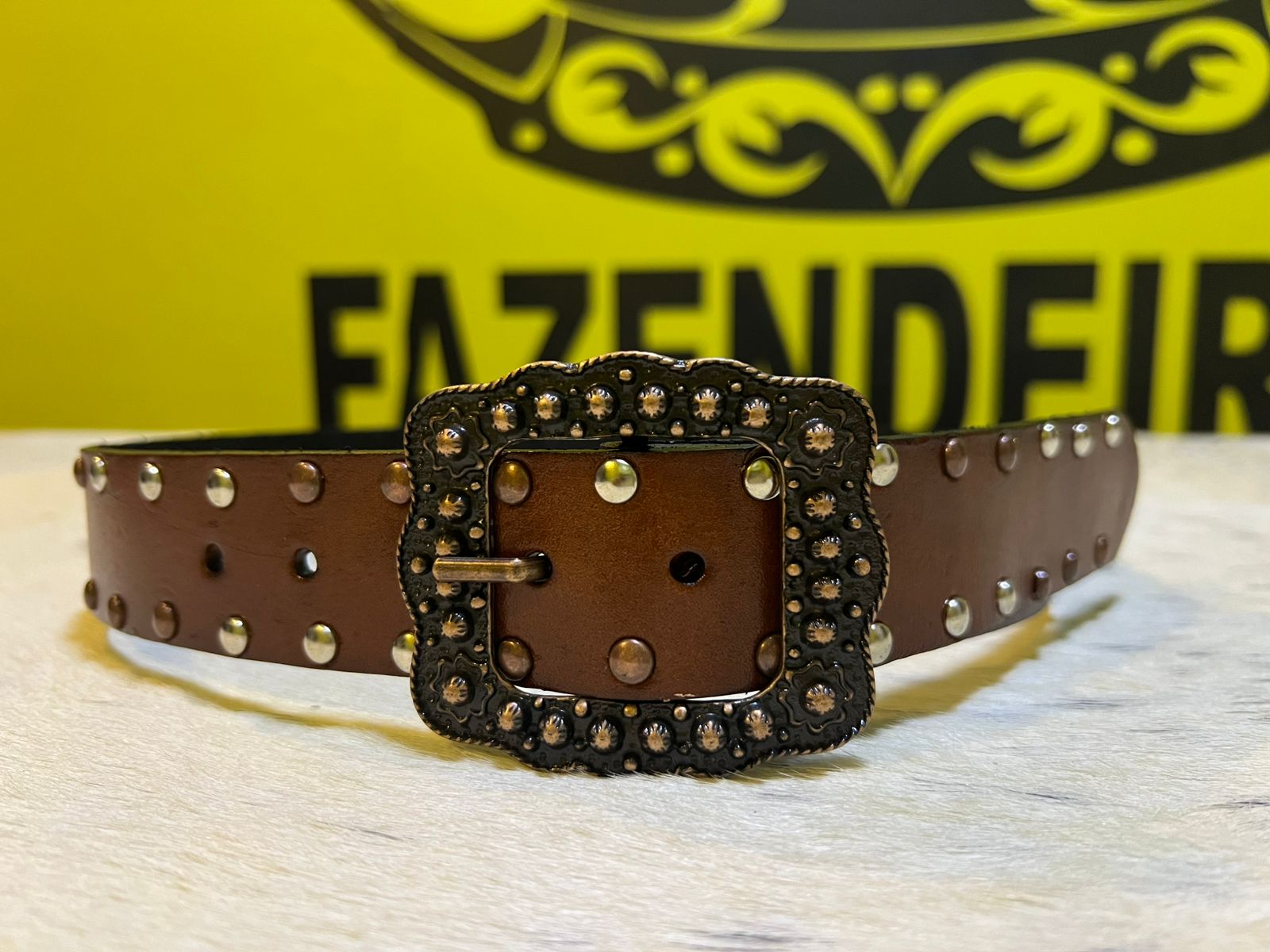 O cinto possui couro marrom trabalhado com detalhes em relevo e uma fivela na cor preta enfeitada por relevos, que reforçam o estilo country. O fechamento é prático e seguro com fivela tradicional. O produto é indicado para quem busca uma peça única com qualidade e acabamento sofisticado.